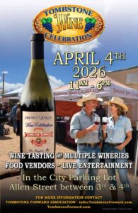 The Tombstone Wine Celebration will be in the Tombstone City Parking lot on Allen Street between 3rd & 4th and is sponsored by Tombstone Forward Association. The Celebration will take place on April 4th, 2026 from 11am to 6pm. Tickets are available at the entrance. You will get a commemorative wine glass and 10 wine sampling tickets. Must be 21 years of age or older to sample the wines; ID required.